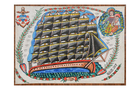 Thompson, known for his tattooing since 2004, has taken time since the pandemic to return to canvas and painting for this body of work. Out of Bound is both a direct connection to Thompson’s ‘Huck Finn’ spirit, and his inspiration found in the work of the late Tino “Rosie” Camanga. Rosie was a self-taught tattoo artist in Honolulu, and is a largely influential artist for countless tattooists. Nods to Camanga can be found in Thompson’s portrait of the late artist (Lonely Boy) as well as the ‘wavy hearts’ seen on a few works in the exhibition. “Out of Bound” is a text quote from Camanga found on a piece of flash found in Ed Hardy’s book, Folk Art Tattoo Flash.