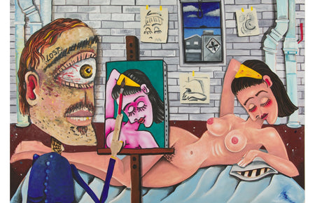 “I paint, above all else, in an attempt to join the lineage and conversation of the artists I admire who have come before me. These inspirations include fine artists such as painters as well as craftsmen such as tattooers. Through a visual language that mixes all of the above, I aim to explore doom, hope, and the gray area that lies between.”